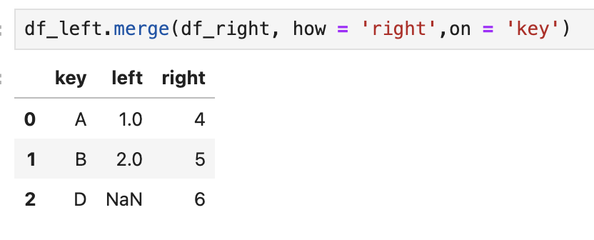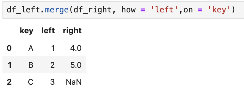 현재 기준이 되는 데이터는df_left이고 how를 통해 key칼럼에 표시될 데이터를 고를 수있다.