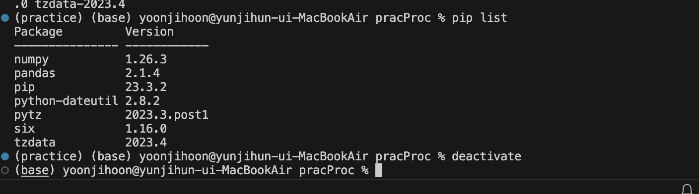 명령어 pip list를 입력하여 현재 가상환경에 설치된 라이브러리를 확인 할 수 있음