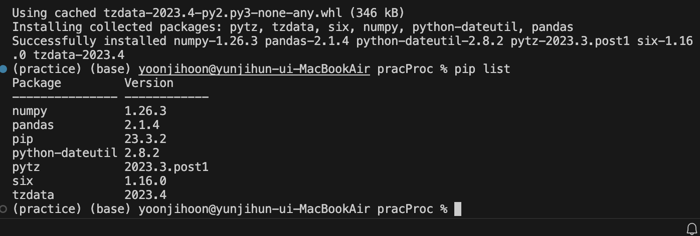 명령어를 통해서 넘파이와 판다스 설치후 pip list를 통해서 확인